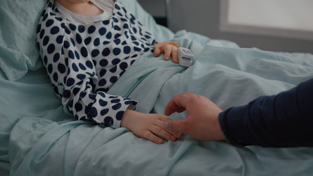 Close up of father sitting with sick daughter in hospital ward holding hands after suffering sickness infection. Sad child resting in bed with medical oximeter on finger waiting for disease treatment