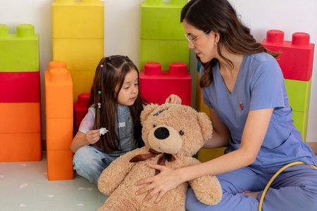 Pediatrician playing doctor with little girl and teddy bear