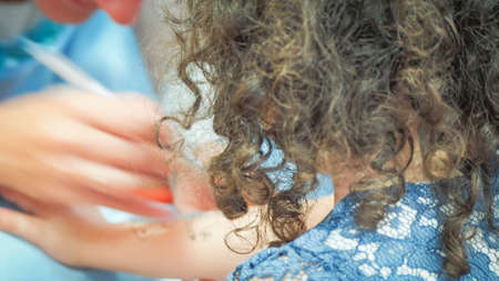 A little girl is curing a tooth from a dentist.