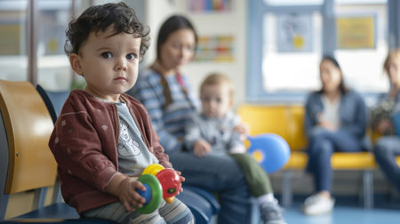 A shot of a family sitting in the waiting area one child playing with a toy while the parents look at the schedule board