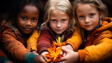 Three multiethnic kids with flower in hands looking at camera on blurred background