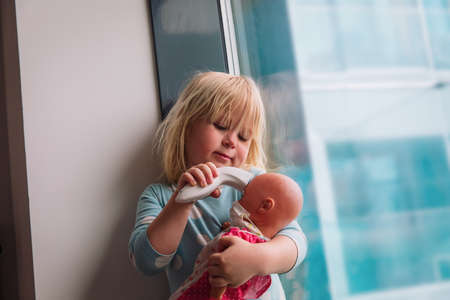 Little girl using electronic thermometer for doll with mask at home. Pandemic COVID-19