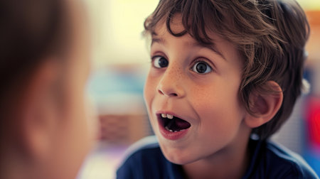 Close up photography of child whispering at classroom with blurring background. Happy elementary student chitchatting or talking or sharing secret together with diverse friend with curious. AIG42.