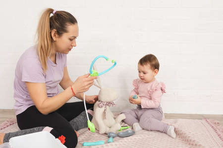 Two girls playing in hospital girl in white coat examining the little patient they playing at home