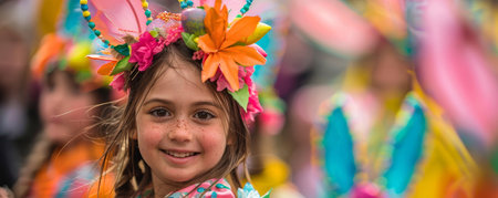 A joyful young girl with brown hair and a colorful costume smiles during a festive parade. She wears a vibrant headdress adorned with flowers and feathers.