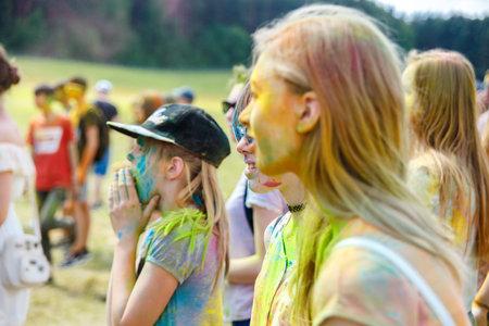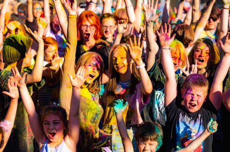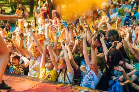 Russia, Chekhov, July 2, 2022. Cheerful youth holiday Holi spilling colorful paints