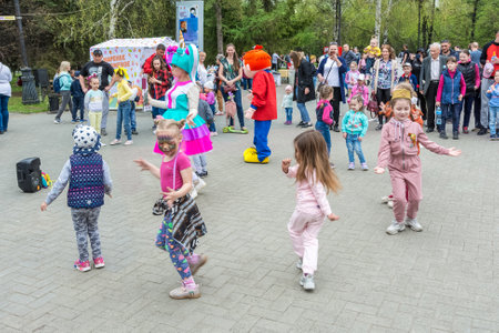 Chelyabinsk Russia May 10, 2021 festive events in the park of culture and recreation. Children dance a fun dance.