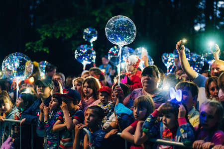 VICHUGA, RUSSIA - JUNE 17, 2018: A crowd of people at the evening event