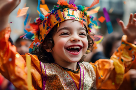 Joyful caucasian child celebrating in colorful carnival attire with confetti, Purim.