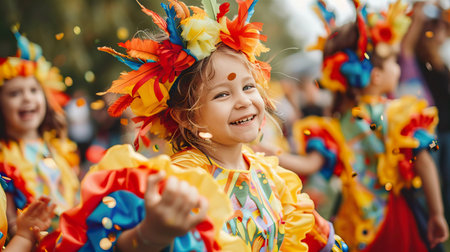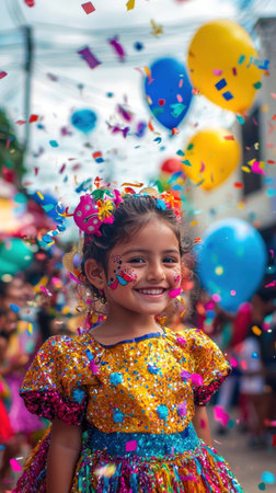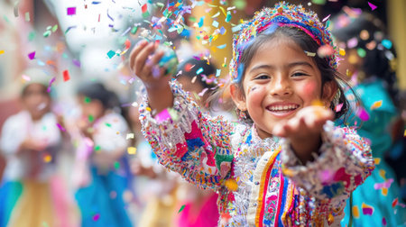 Vibrant street festival scene with a smiling young girl wearing a colorful traditional costume and throwing confetti surrounded by a lively crowd in a festive urban environment