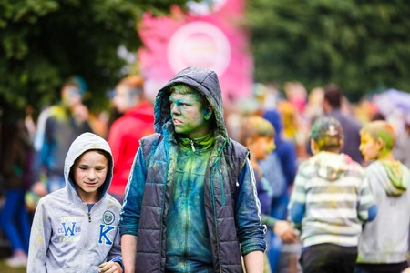 Kaliningrad, Russia - July 08 2017: Young people are celebrating the Holi festival during the city day of Kaliningrad in rainy weather