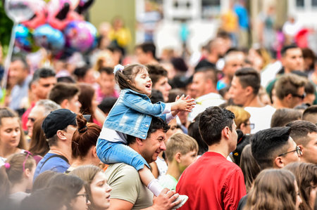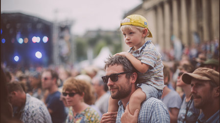 Child has fun on her parents' shoulders keeping hands with them at an outdoor rock music concert