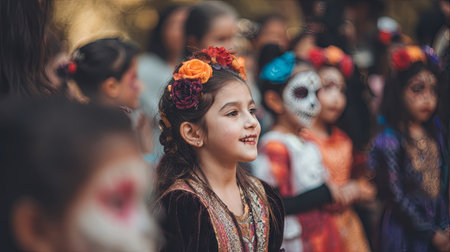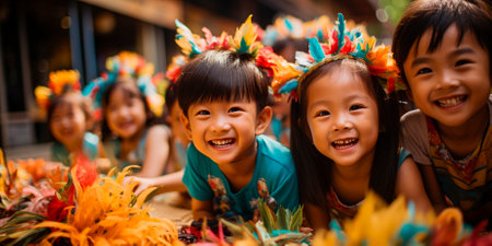 Young children gather in colorful costumes and makeup, radiating joy during a vibrant cultural celebration, highlighting traditional attire and community spirit.