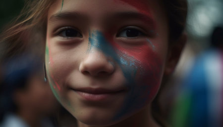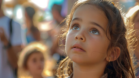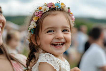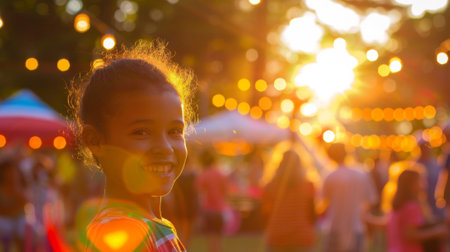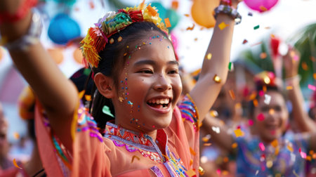 A young girl expresses pure joy during a lively cultural celebration, surrounded by colorful decorations and playful confetti, capturing the spirit of community and festivity.