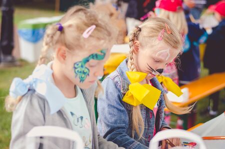 MOSCOW, RUSSIA - April 24, 2019: children and adults at the table do needlework and paint on the street on a sunny day. children's Day. developing club for children with disabilities
