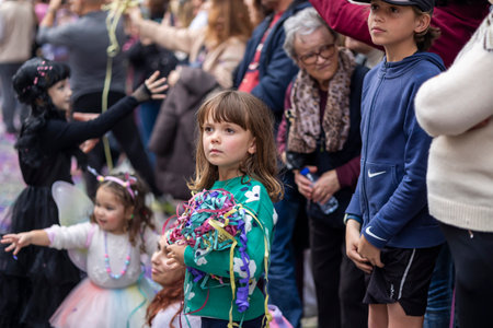 LOULE, PORTUGAL - 17th FEB 2024: Colorful Carnival (Carnival) Parade festival audience participants on Loule city, Portugal.