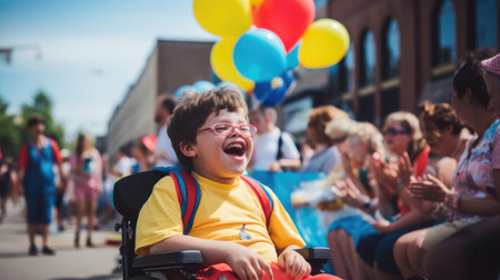 Lively parade with a person with Down Syndrome joyfully participating.