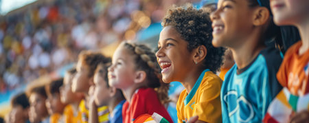 Cheerful kids in sportswear watching football match on stadium