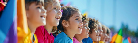group of happy kids looking at camera and holding rainbow flags in park