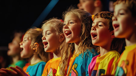 A lively scene of joyful children singing on stage, showcasing colorful costumes and bright expressions during a vibrant music performance, radiating happiness and energy.