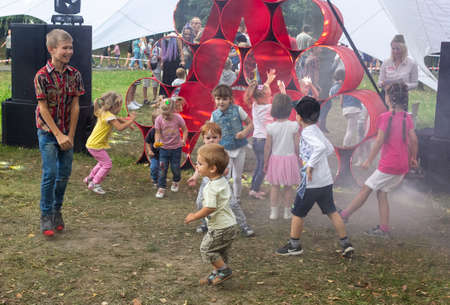 A group of children dancing on a green lawn in Victory Park. Minsk, Belarus. September 9, 2018