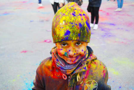 beautiful baby covered in colors in the face after color run party of colors. High quality photo