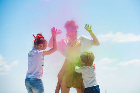 Children with paintings face play with colored splash powder and color dust.
