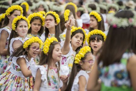 children dressed in colorful clothes at the Festa da Flor or Spring Flower Festival in the city of Funchal on the Island of Madeira in the Atlantic Ocean of Portugal. Madeira, Funchal, April, 2018