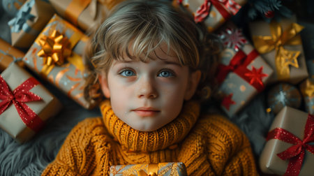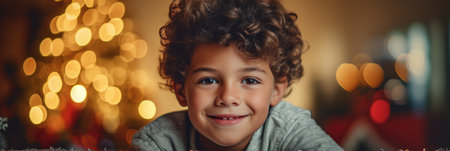A joyful young boy displays a big smile as he enjoys a festive atmosphere filled with colorful decorations and wrapped gifts. The background features a beautifully decorated Christmas tree..