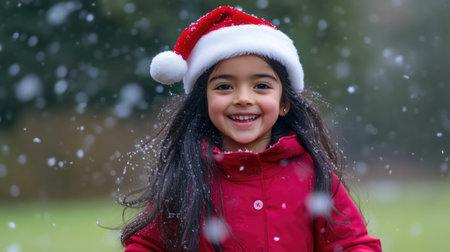 Little girl in vibrant red coat, green hat, smiling in snowy winter wonderland, evoking holiday cheer warmth.