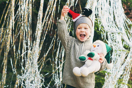 Outdoor portrait of happy and excited little boy posing next to decorated pine tree, holding snowman toy, wearing reindeer ears and Santa Claus hat