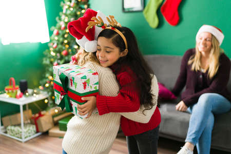 Thank you so much. Cute hispanic daughter hugging her mom for giving her a Christmas present