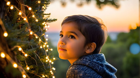 Over-the-shoulder shot of a child staring at the tree, mesmerized by twinkling lights