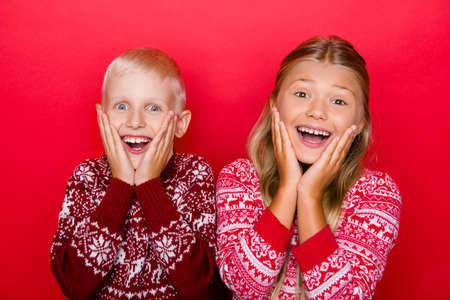 Adorable, charming small relatives with beaming smiles, shocked of unbelievable, unexpected presents, in traditional x mas clothing, isolated on red background, holding faces with arm palms