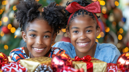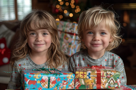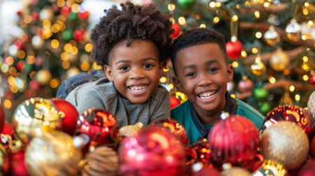Two ecstatic children, eyes wide with wonder, tear open Christmas presents beneath a beautifully decorated tree The joyful atmosphere of the holiday season is palpable as they revel in the excitement of the moment This heartwarming image captures the magic of Christmas and the joy of family traditions AI Generative