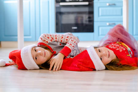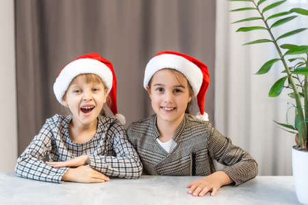 Merry Christmas. Portrait of two happy funny children girls in Santa hat with Christmas wreath. Happy Holidays. Fairy Magic. Happy kids enjoying holiday. Christmas in July