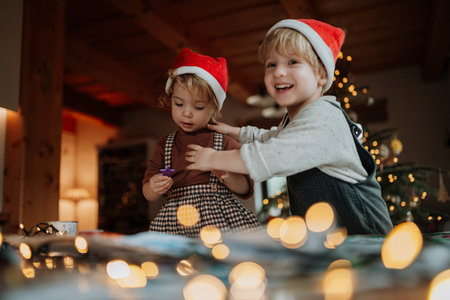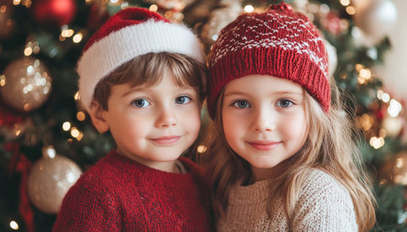 Intimate, cozy scene of two children dressed in sweaters enjoying the Christmas holidays in a warm, dimly lit home with a decorated tree. Ideal for themes of family, love, tradition, storytelling, childhood wonder, and festive celebrations.