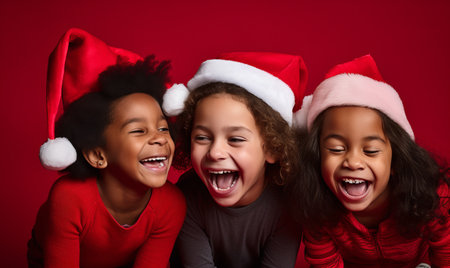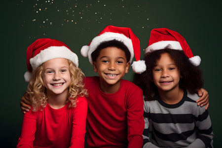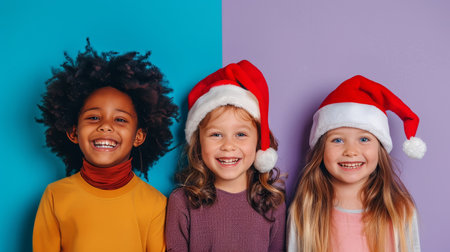 Three smiling children wearing Christmas hats and colorful outfits against a blue and purple background.