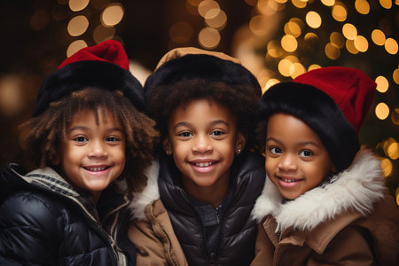 Happy mulattoes, boys, girl in New Year's atmosphere smiling. Festive Christmas atmosphere, approaching New Year. Happy childhood.