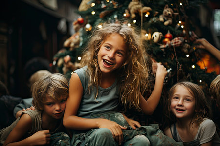 Excited Kids Gathered Around the Christmas Tree in Their Pajamas Ready to Unwrap Gifts