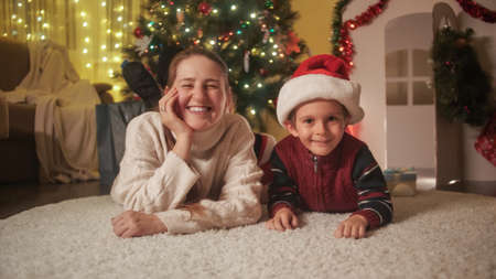 Smiling mother with son lying on floor next to Christmas tree and having fun. Families and children celebrating winter holidays.