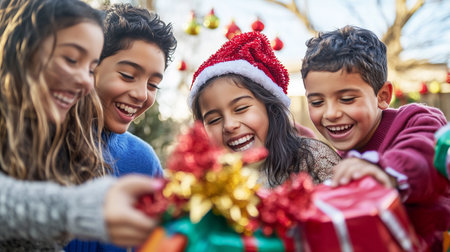 A group of joyful children, one wearing a Santa hat, eagerly opening Christmas presents outdoors, surrounded by festive decorations and holiday cheer.