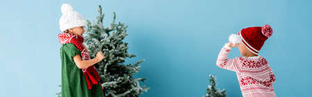 panoramic shot of kids in winter outfit playing snowballs near christmas trees on blue