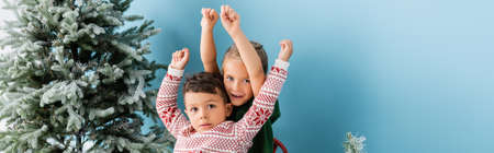 panoramic crop of excited kids with hands above heads sitting in sleigh near green pine on blue