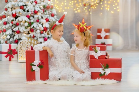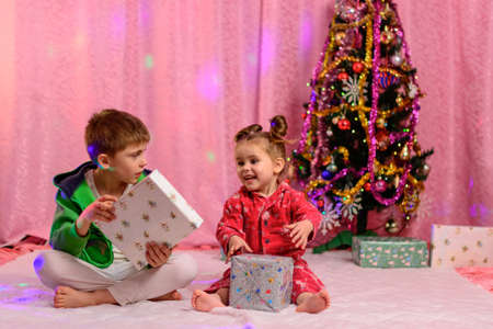 A brother and sister are looking at presents near the Christmas tree on Christmas Eve. new