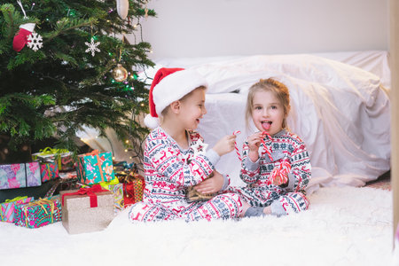 Children in festive pajamas eating Christmas candy canes from jar of holiday treats beside decorated Christmas tree during the festive season. Joyful siblings sit on cozy rug, enjoying festive sweets
