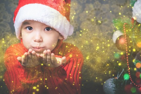 Little boy fairy blowing fairy magical glitter, stardust at Christmas