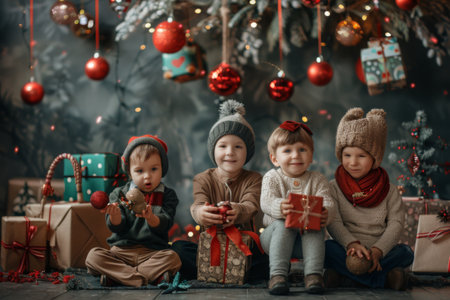 Four cheerful kids in winter attire holding gifts, surrounded by colorful decorations and twinkling lights, creating a warm festive atmosphere filled with joy.