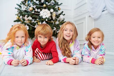 Merry Christmas and Happy New Year! Happy children are lying under the Christmas tree waiting for Santa Claus and gifts.