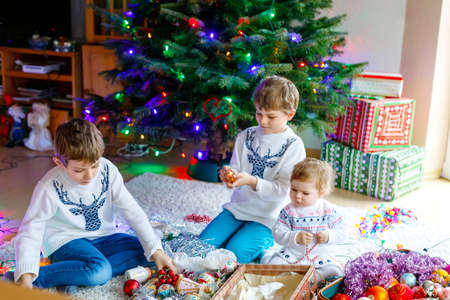 Two little kid boys and adorable baby girl decorating Christmas tree with old vintage toys and balls. Family preaparation celebration of family holiday. Three children, brothers and sister at home.